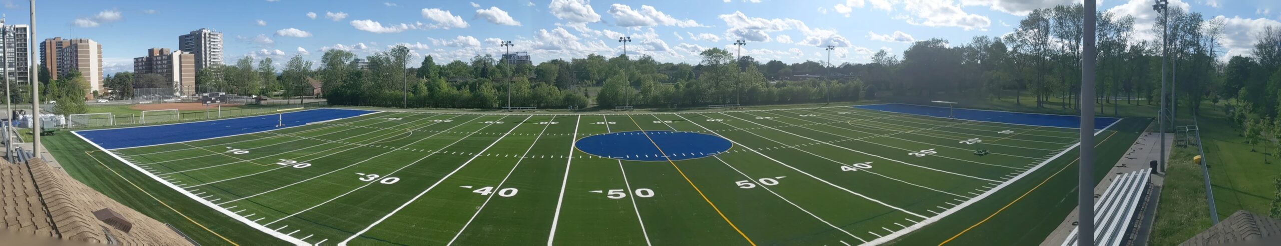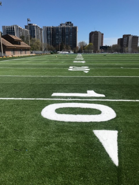 Our team provided general contracting services to the sports field at Bronte Athletic Park after the old synthetic turf had reached its end of the life cycle. We incorporated a sustainable sports field reclamation initiative, resulting in the old turf field being repurposed. This project included laser grading the existing dynamic aggregate base, installation of synthetic turf with custom lines, a performance shock pad, Holo TPE infill, soccer nets, and football goal post uprights.