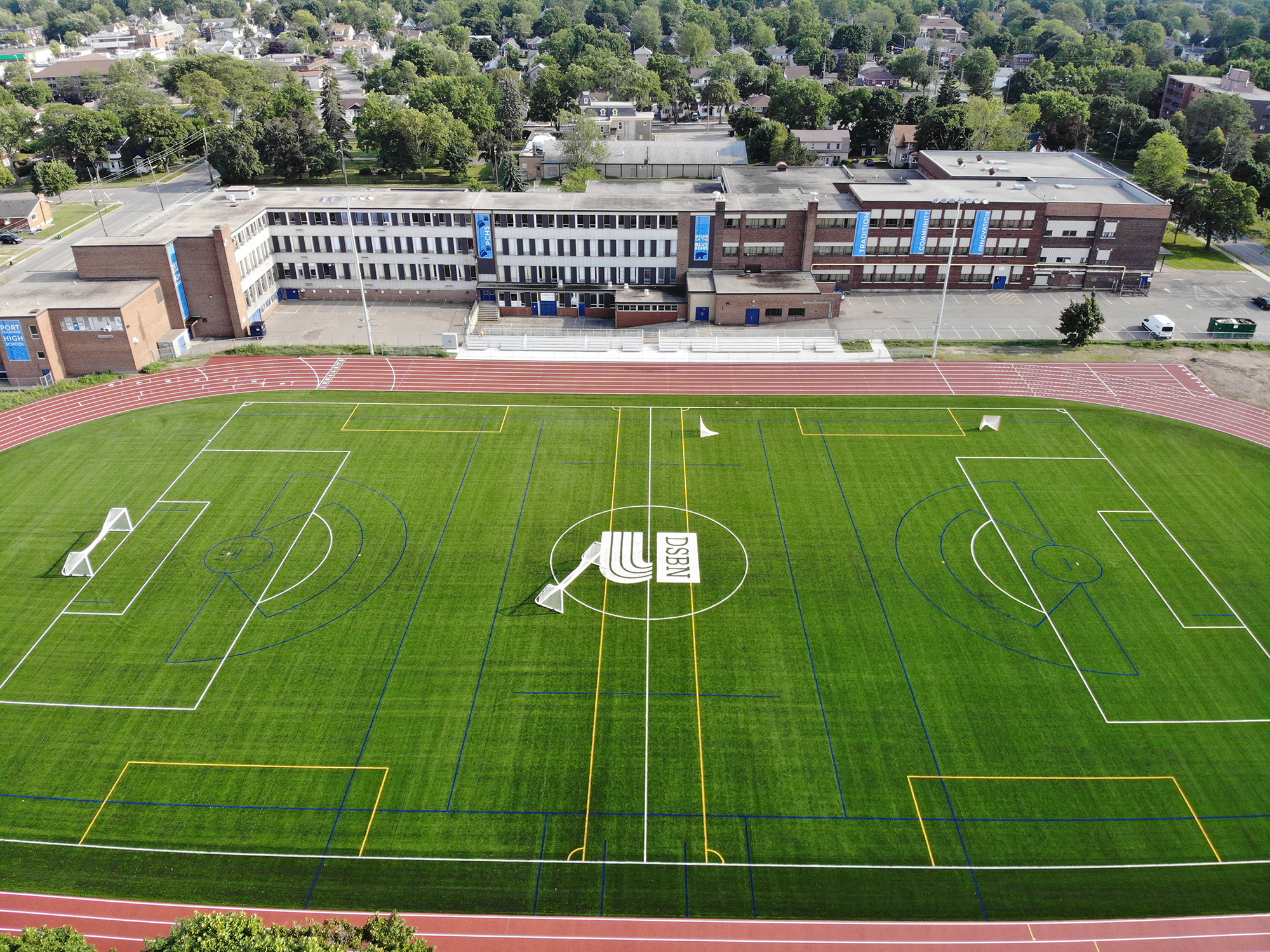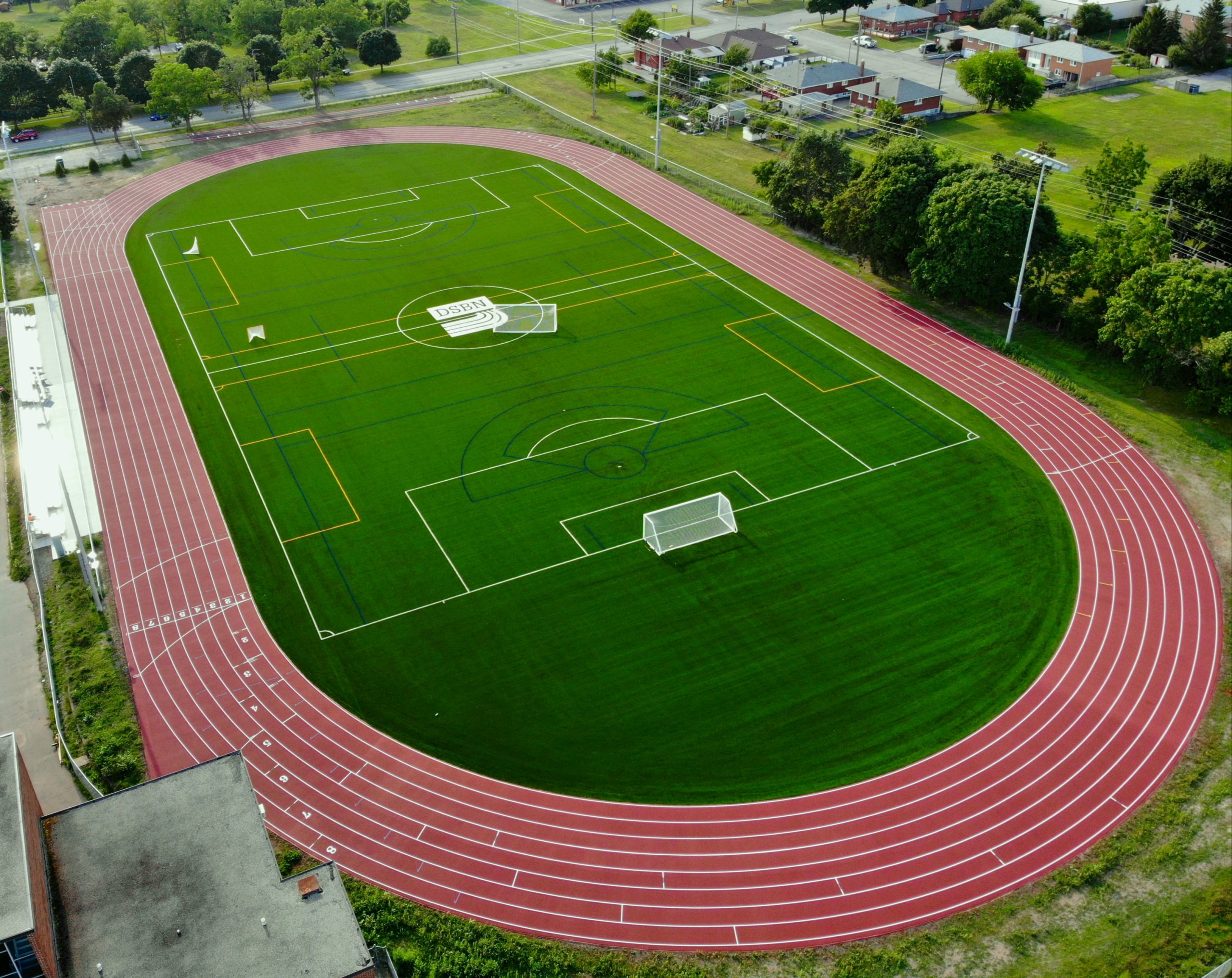 Our team provided general contracting services for the District School Board of Niagara. This project included the removal of existing natural grass, construction of a dynamic aggregate base, the installation of FIFA Quality compliant synthetic turf with custom lines, logos, infill, field lighting, six-lane running track, six hundred seat bleachers, and site amenities.