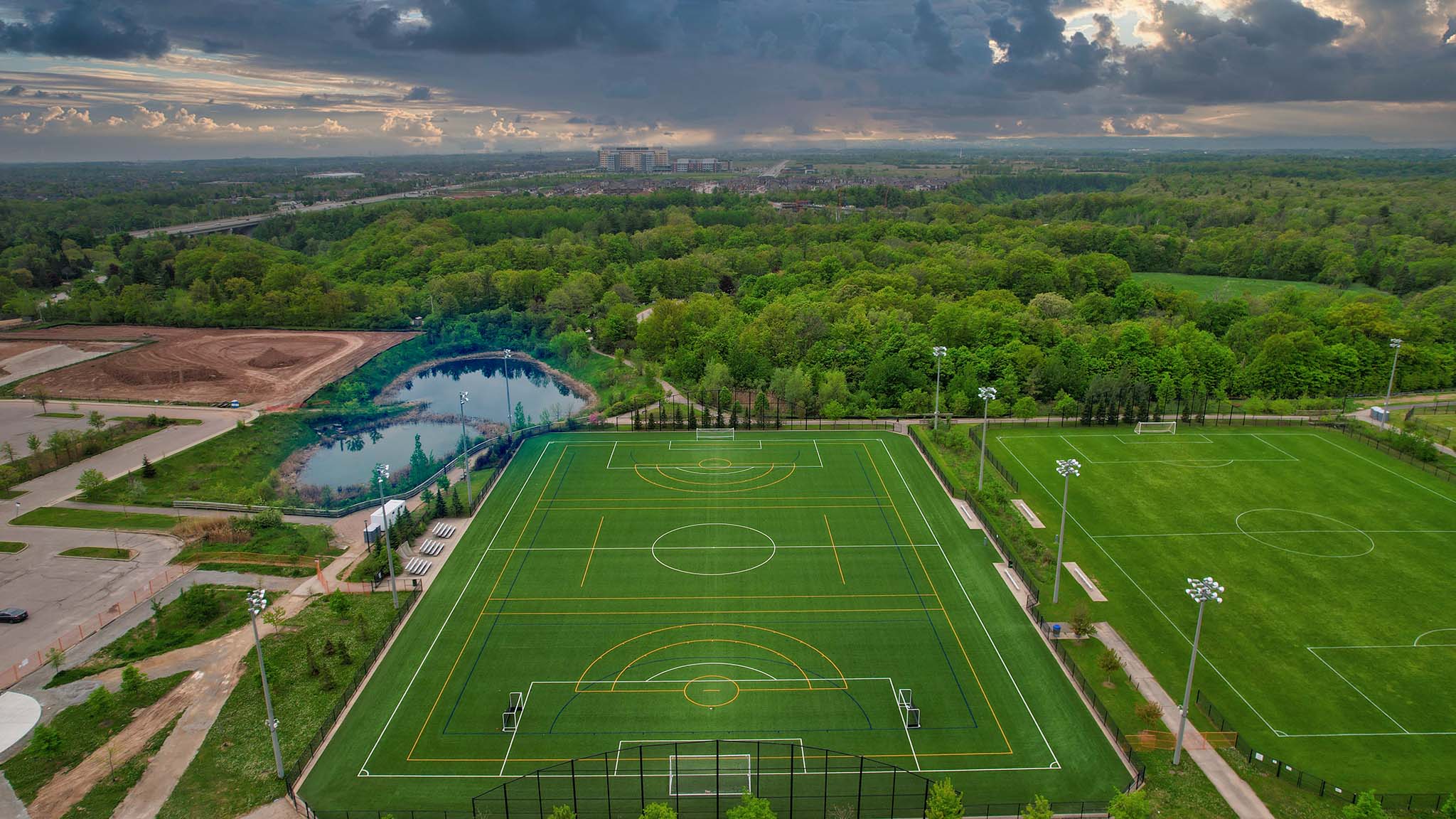 Our team provided installation services for the City of Oakville at the newly redesigned Sixteen Mile Sports Complex on Fields 1 and 4 . After the old synthetic turf had reached its end of the life cycle on Field 1, we incorporated a sustainable sports field reclamation initiative, resulting in the old turf field being repurposed. This project included laser grading the existing dynamic aggregate base, installation of FIFA One Turf Concept compliant synthetic turf, performance shock pad, TPE infill and custom lines for Soccer, Lacrosse, Field Hockey and more for the two of the fields.