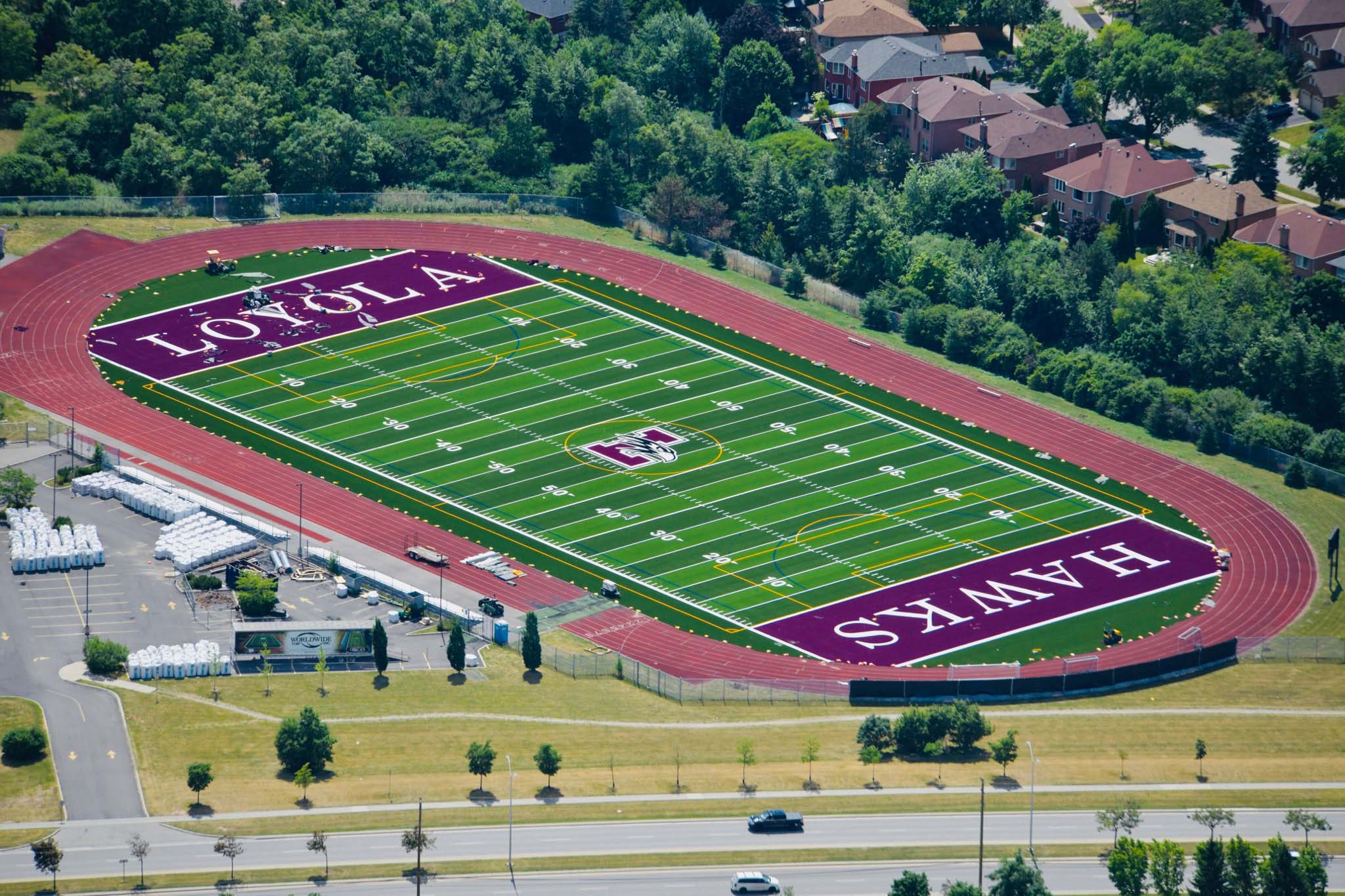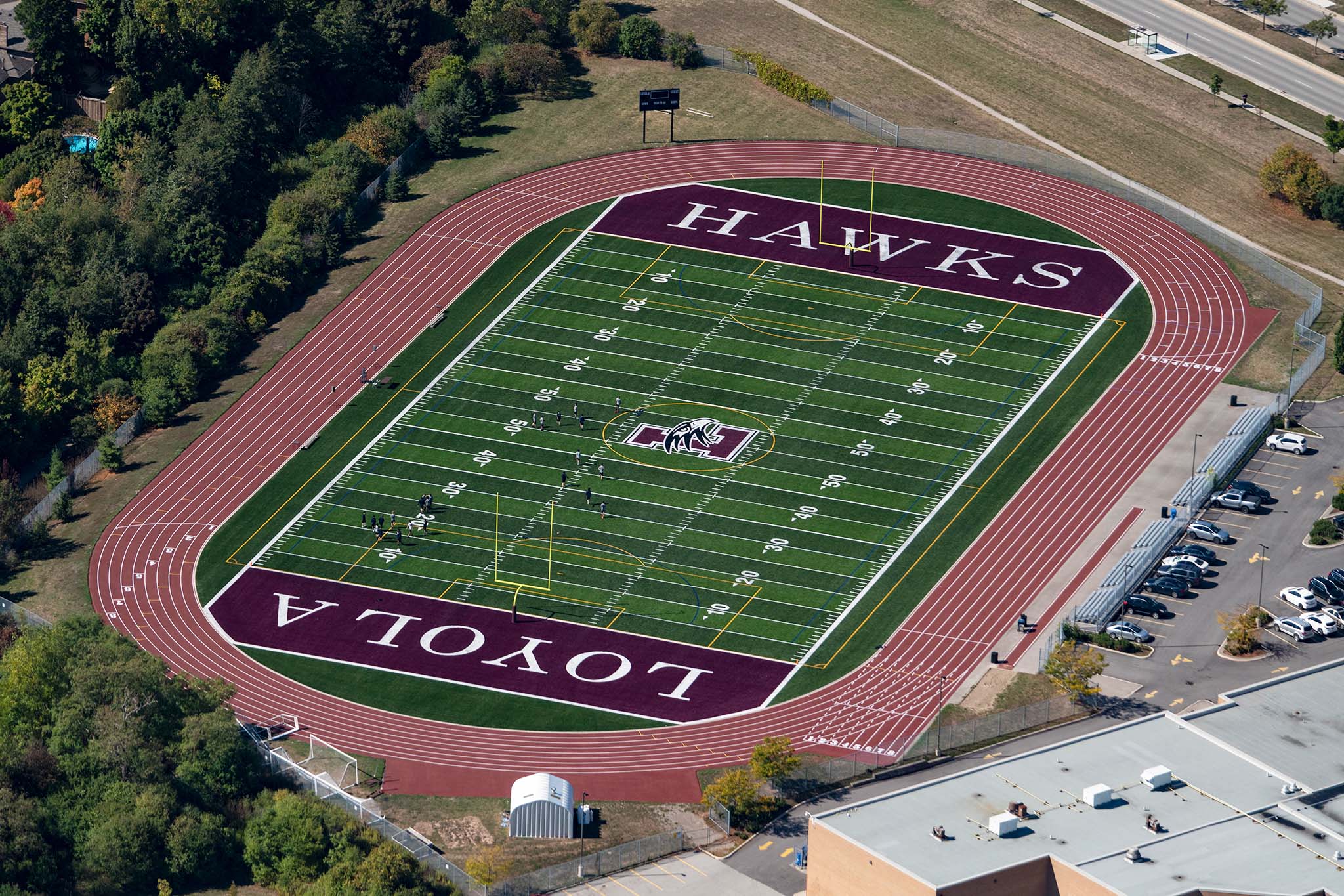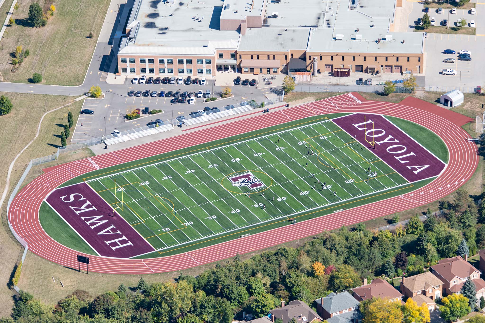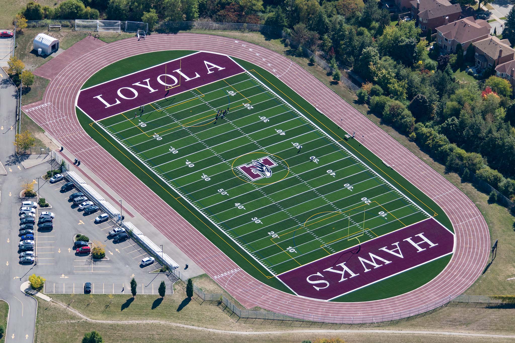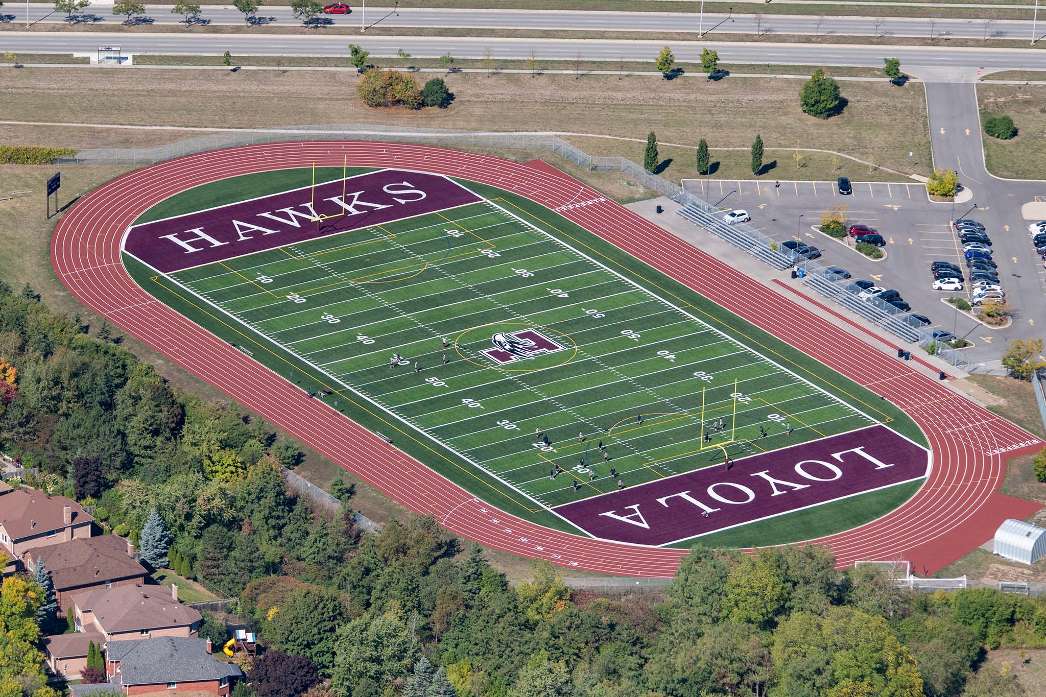 Our team provided general contracting and installation services for the Halton District Catholic School Board. After the old synthetic turf had reached its end of the life cycle, we incorporated a sustainable sports field reclamation initiative, resulting in the old turf field being repurposed. This project included laser grading the existing dynamic aggregate base, and installation of a multi-purpose synthetic turf field, with infill, custom-made centre field & end zone logos and lines for this multi-purpose field for Football, Soccer, Lacrosse, Field Hockey and more. New field amenities included Football posts and soccer nets.